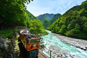 険しい峡谷の中にある観光鉄道で宇奈月温泉~欅平までの全長20キロの鉄道路線になります。